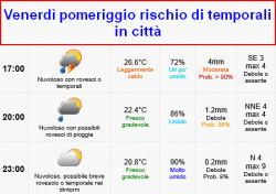 Già venerdì pomeriggio il modello prevede un episodio temporalesco in città, altri potrebbero scoppiare nella giornata di sabato; la domenica, nonostante alcuni prolungati momenti soleggiati, non si presenterà del tutto soleggiata.