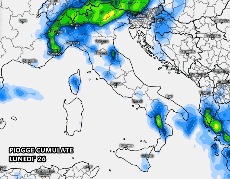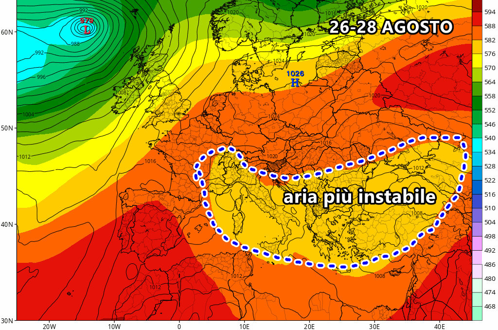Lunedì 26 Agosto ci aspettiamo la formazione dei primi forti temporali al nord, specie su Alpi, Prealpi e settori pedemontani. Locali fenomeni anche sull’Appennino settentrionale, Calabria settentrionale e potentino.
