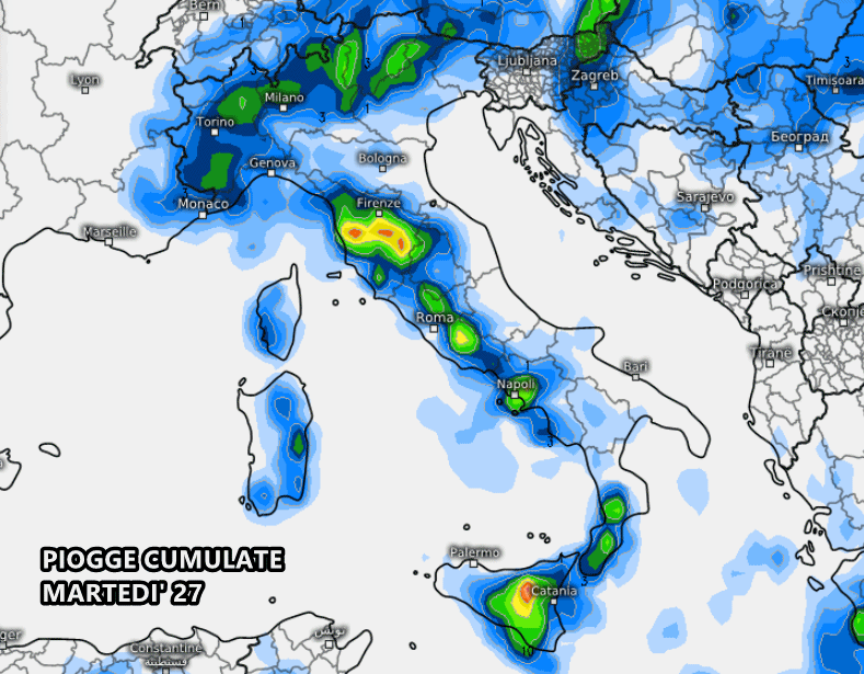 Martedì 27 l’instabilità entrerà nel vivo da nord a sud: tanti rovesci e temporali pomeridiani/serali potranno prender vita dalle Alpi alla Sicilia, concentrandosi prettamente nei settori interni dello Stivale. Sulle coste i fenomeni saranno più rari, localizzati più che altro sulle aree tirreniche, mentre sul settore adriatico avremo prevalenza di cielo sereno o poco nuvoloso.