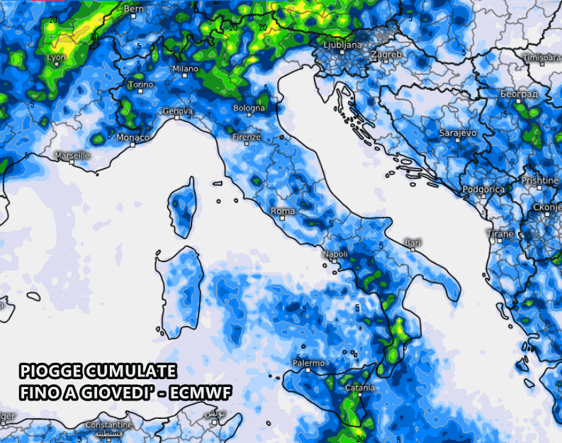 Anche il modello europeo ECMWF mostra molta instabilità tra lunedì e giovedì. Accumuli più sostanziosi per il nord, Calabria, Campania e Sicilia.