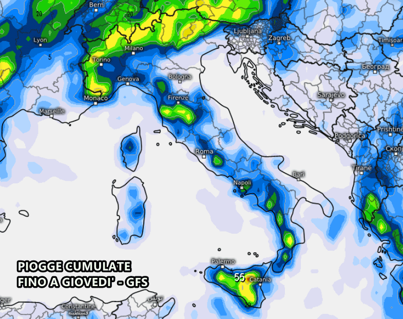 Nel computo totale delle precipitazioni previste fino a giovedì 29, secondo il modello americano GFS, si evincono accumuli discreti su Alpi, Prealpi e lungo l’Appennino. Sia chiaro, si tratterà pur sempre di fenomeni disorganizzati, assolutamente non in grado di risolvere o attenuare il problema della siccità.