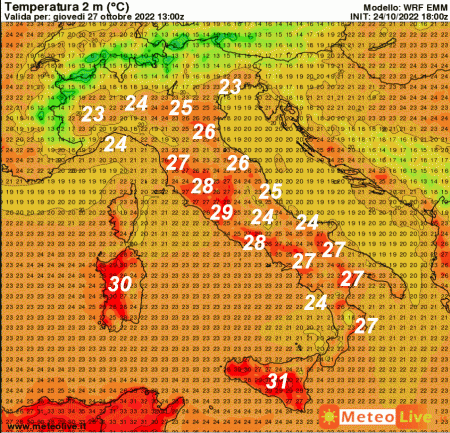 Tra giovedi 27 e venerdi 28 ottobre sarà praticamente estate su diverse regioni con temperature massime che in alcuni casi potrebbero raggiungere i 30°, un’anomalia assurda che surclasserà la parte finale del mese statisticamente più piovoso dell’anno.