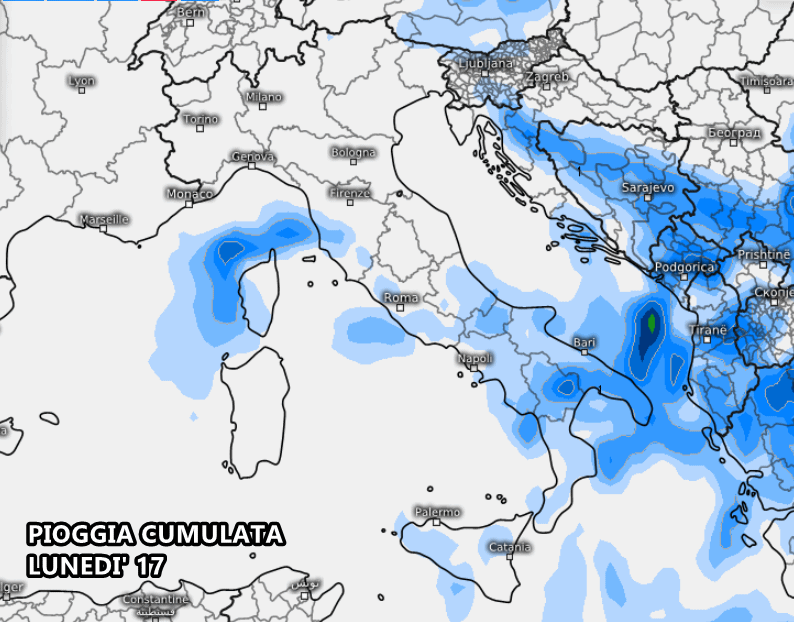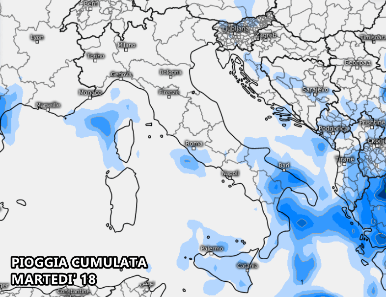 A partire da lunedì, infatti, le regioni adriatiche e il Meridione saranno lambite da aria fredda proveniente dai Balcani, ossia le briciole dell’immenso serbatoio gelido che invaderà l’Est Europa e il Mar Nero. Questi deboli refoli freddi balcanici daranno luogo ad addensamenti sparsi e qualche piovasco tra Puglia, Basilicata, Calabria e, molto marginalmente, su Molise e Sicilia.