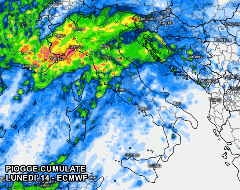 Secondo il modello europeo ECMWF, la perturbazione potrebbe incidere maggiormente sulle regioni settentrionali, dove si prevedono accumuli di pioggia diffusamente superiori ai 15 o 20 mm, con picchi di oltre 50 mm in Liguria. Le piogge transiterebbero anche sulle regioni centrali e, inoltre, non si esclude il passaggio di qualche forte temporale, soprattutto tra Liguria e Toscana: