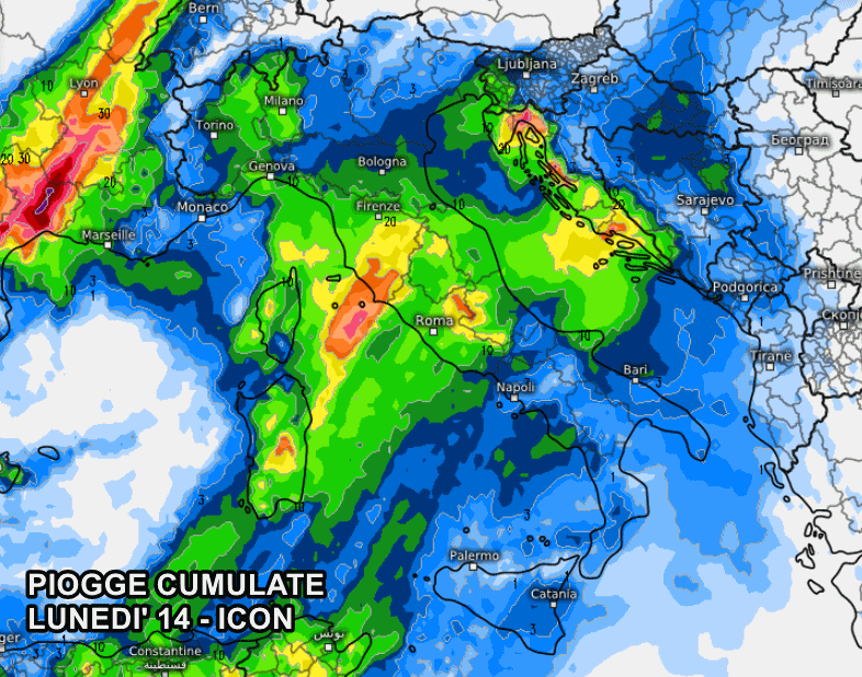Il modello ICON propone invece un passaggio un po’ più meridionale del fronte perturbato, ragion per cui potrebbero essere proprio le regioni centrali il focus principale del maltempo. Le nubi interesserebbero anche il Nord, ma con precipitazioni più blande e relegate principalmente al nord-ovest.