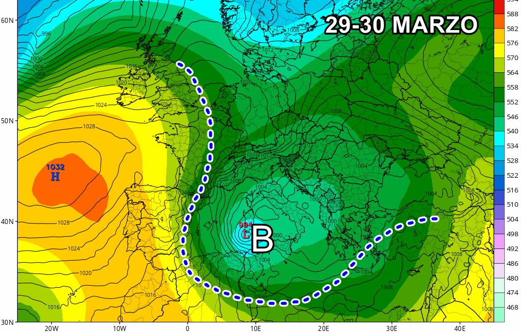 Nel fine settimana è confermata una nuova ondata di maltempo, ovvero una perturbazione di stampo nord-atlantico, colma di aria fredda in quota, pronta a immergersi nel Mediterraneo. Questo nucleo instabile porterà allo sviluppo di un ciclone insidioso, con minimo barico nei pressi della Sardegna che potrebbe raggiungere i 994 hpa. Si tratterebbe di un vortice depressionario piuttosto organizzato e colmo di maltempo, il quale investirebbe soprattutto le regioni centro-meridionali.