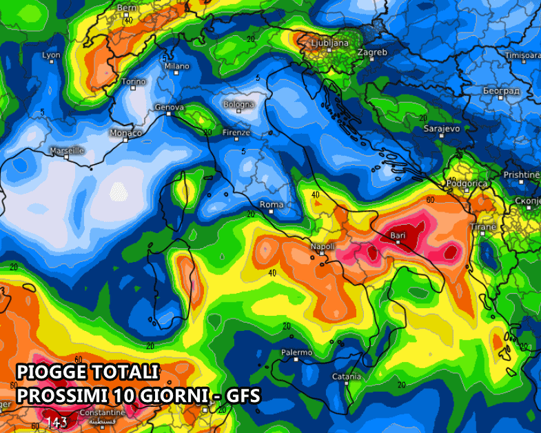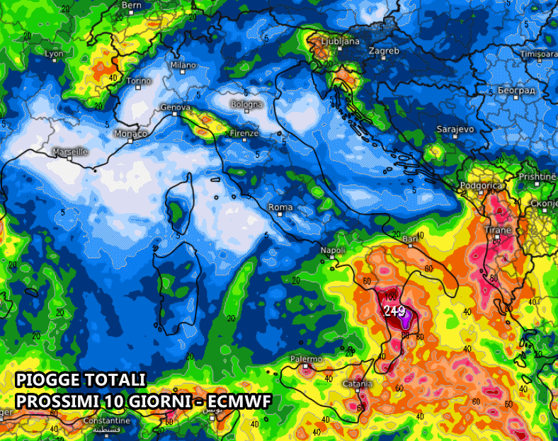Osservando le piogge totali previste nei prossimi 10 giorni, ovvero fino al 18 gennaio, si evidenziano fenomeni molto più abbondanti al Sud e sulle Isole Maggiori, a causa di un ciclone che tra domenica e martedì prossimo agirà sui mari meridionali. I fenomeni potrebbero rivelarsi piuttosto marcati e persistenti, specie sull’arco ionico, dove si prevedono picchi di oltre 150 mm di pioggia.