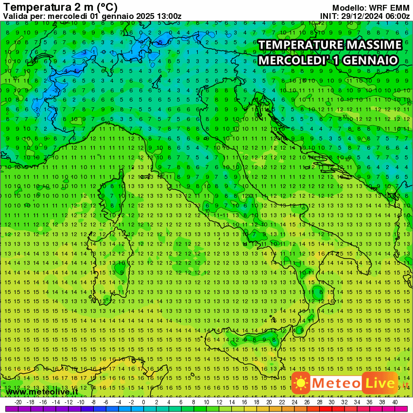 Le temperature massime di mercoledì 1 Gennaio, giorno di Capodanno, il clima resterà freddo al nord a causa delle nebbie, pertanto la colonnina di mercurio faticherà a portarsi oltre i 5-6°C. Discorso diverso al sud e le isole maggiori, dove si prevedono picchi di 15-16°C.