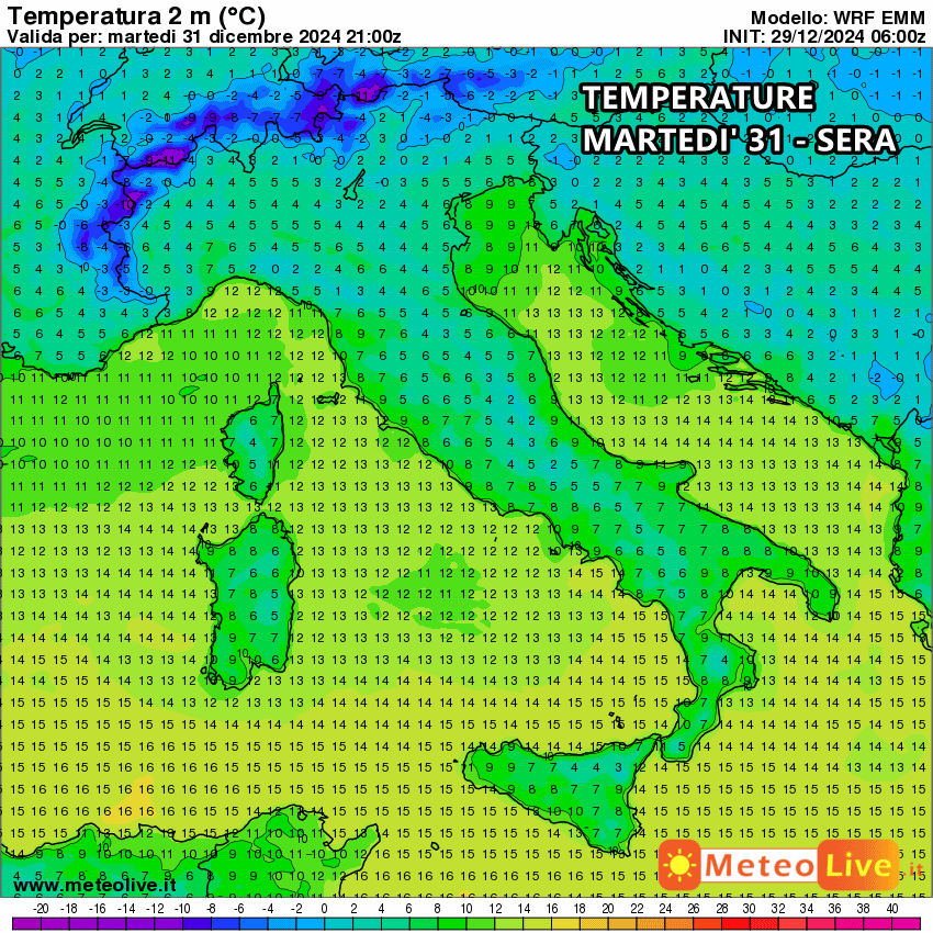 Il clima risulterà freddo nella sera di San Silvestro, con temperature tra i 3 e 5°C in Val Padana e generalmente sotto i 10°C sul resto del centro-sud. Sulle città di mare la colonnina di mercurio oscillerà tra i 6 e i 10°C, mentre nei settori interni farà nettamente più freddo.