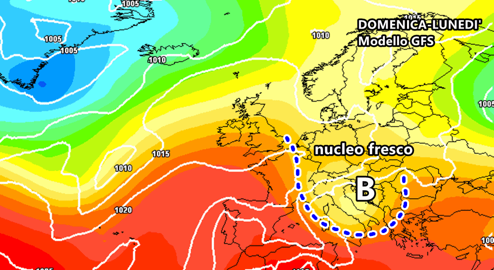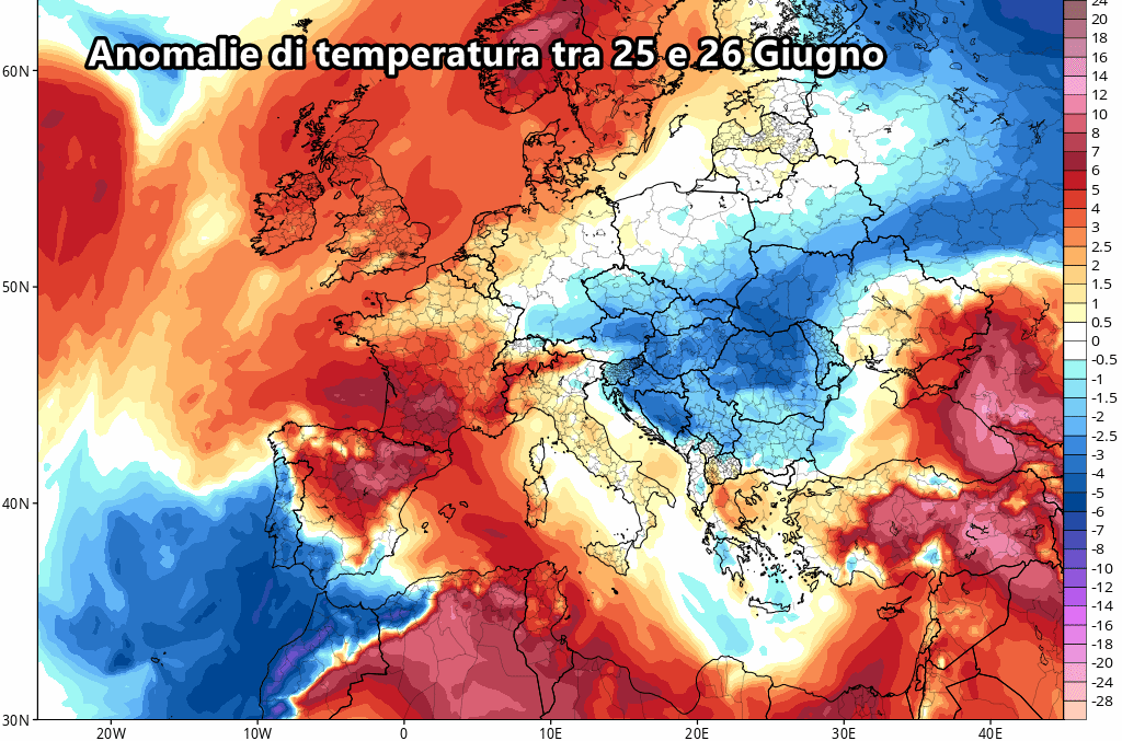 Questa saccatura fresca favorirà un diffuso calo delle temperature, tanto che la colonnina di mercurio potrebbe addirittura portarsi al di sotto delle medie del periodo dopo aver toccato anomalie di almeno 10° al di sopra delle medie tipiche di giugno.