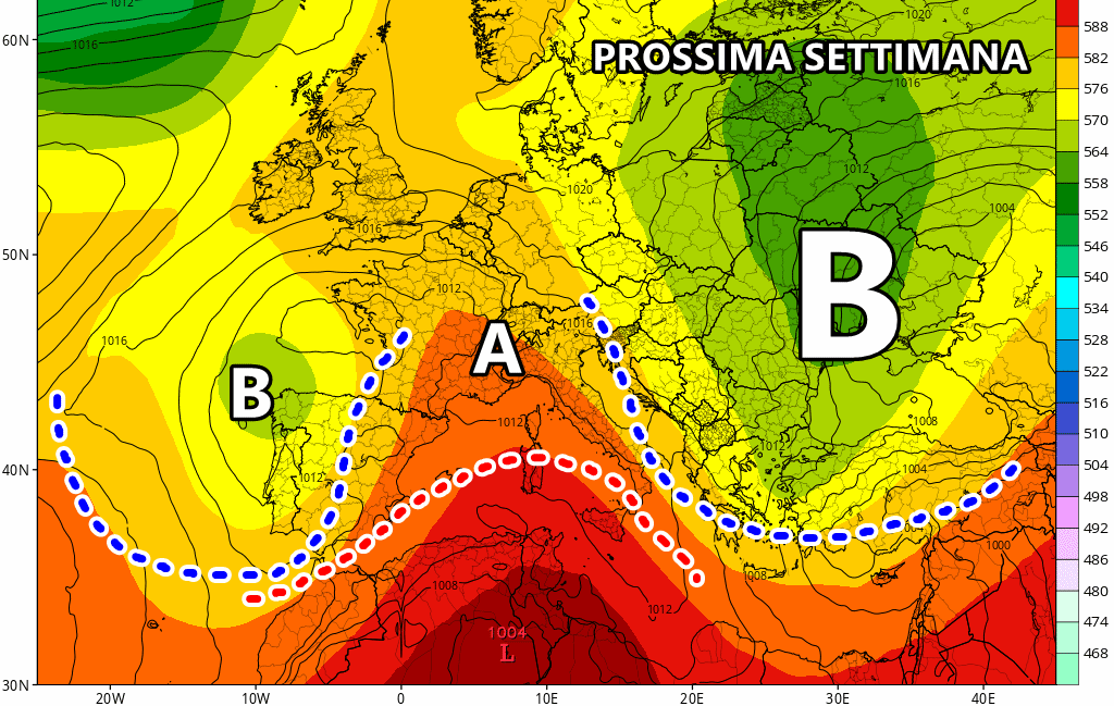 Inoltre, il passaggio di questa perturbazione colma di aria fresca, piogge e temporali farà letteralmente indietreggiare l’anticiclone africano, portando un cambiamento nella disposizione delle principali figure bariche tra Atlantico ed Europa. In effetti, dopo il passaggio di questa perturbazione che spazzerà via il grande caldo dall’Italia e dal Mediterraneo, potrebbe riaffacciarsi l’anticiclone delle Azzorre sull’Europa centro-occidentale.