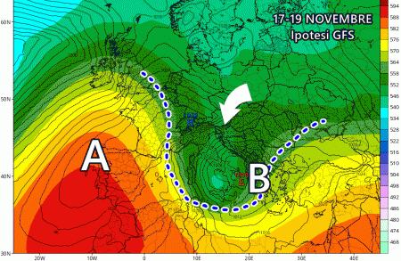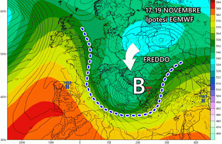 Il modello europeo rimarca la possibilità di un affondo freddo proveniente dalla Scandinavia, reso possibile da una forte espansione dell’anticiclone delle Azzorre verso le alte latitudini. Questa spiccata dinamicità tra alte e basse latitudini potrebbe condurre ad un’avvezione fredda di tutto rispetto per il periodo, indicativamente tra 17 e 19 novembre.