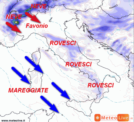 Al nord avremo le solite nevicate sui rilievi alpini di confine che si trasformeranno in venti di Favonio secco sui nostri versanti, con aumento del rischio di incendi. I rovesci riguarderanno le regioni centrali, specie entroterra toscano, Umbria, Marche e Lazio. Rovesci anche al sud, tra la Calabria e la Campania. Per il resto tempo asciutto.
