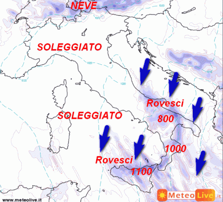 Al nord ultime nevicate sui rilievi alpini di confine, in via di attenuazione, per il resto soleggiato e mite. Bel tempo anche al centro ad eccezione dell’Abruzzo che avrà ancora qualche rovescio al mattino. Tempo instabile invece al sud con rovesci e nevicate sopra gli 800-1000 metri. Ventoso, più freddo e mari in cattive condizioni con mareggiate lungo le coste esposte.
