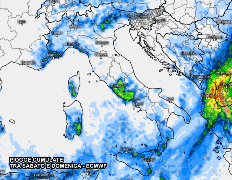Un po’ più avaro di piogge e temporali il modello ECMWF. Il vortice potrebbe rivelarsi molto meno intenso e più distante dall’Italia, ragion per cui i fenomeni risulterebbero più deboli e disorganizzati. Da evidenziare dei temporali forti sul Lazio e precipitazioni disorganizzate su Calabria, Sardegna, Sicilia.