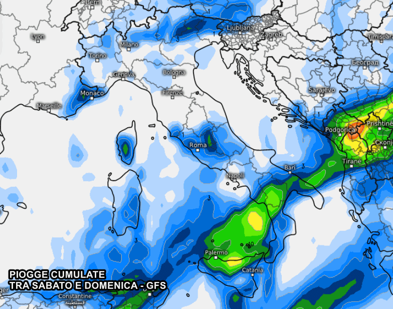 Il modello GFS ci mostra la presenza di rovesci e temporali al sud Italia tra sabato pomeriggio e domenica mattina: potrebbe svilupparsi un fronte temporalesco molto ampio e colmo di precipitazioni. Rischio nubifragi, grandinate e forti raffiche di vento tra Sicilia, Calabria tirrenica, Basilicata, Puglia centrale/brindisino.
