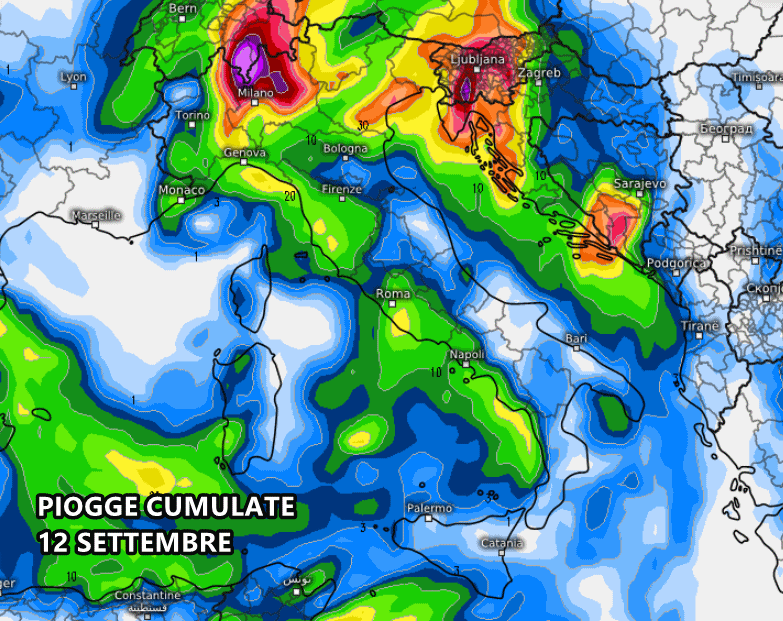 Le prime avvisaglie di maltempo arriverebbero al nord nella sera di mercoledì 11, poi nella giornata successiva le piogge sarebbero molto frequenti e diffuse su tutto il nord e le regioni tirreniche. Spuntano picchi superiori ai 100 mm in Lombardia.