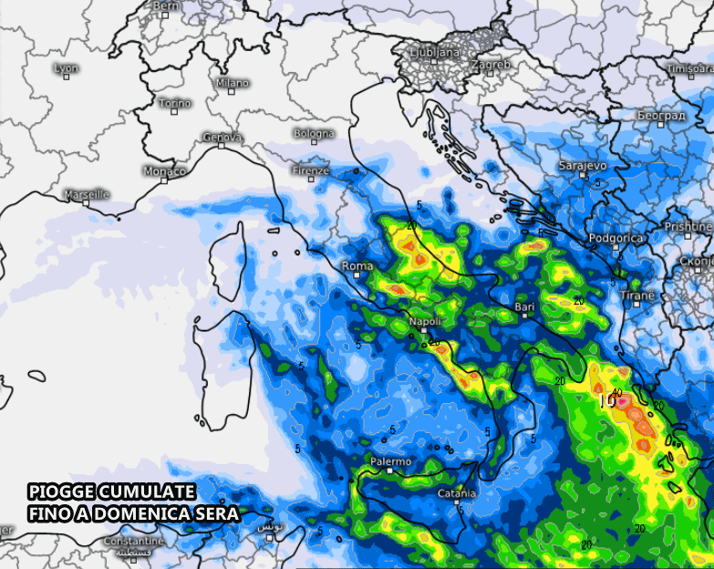 Questo piccolo nucleo di aria fredda ha scavato una depressione sul Mar Tirreno, che pian piano si sta muovendo verso Sud, continuando a generare piogge, rovesci e temporali sparsi. Altre precipitazioni arriveranno durante la giornata odierna su buona parte del Meridione e sul medio-basso Adriatico, con accumuli pluviometrici che, tra Abruzzo e Molise, potrebbero superare i 40 o 50 mm.