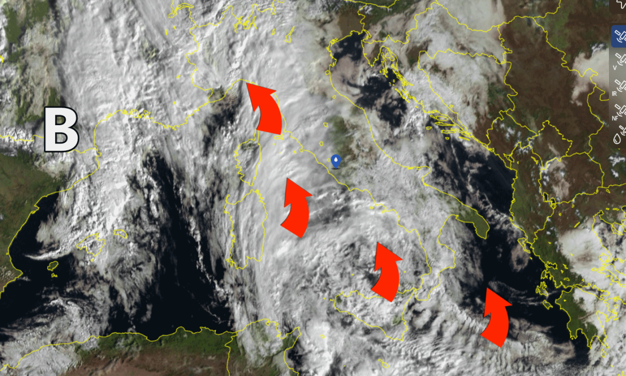 Il satellite parla chiaro: una nuova ondata di maltempo ha raggiunto la nostra Penisola. Si tratta di una depressione attualmente centrata sul Mediterraneo occidentale, che sta già generando molte nubi su gran parte d’Italia. Al momento, la nostra Penisola si trova sul ramo umido ascendente di questa depressione, con precipitazioni più abbondanti sul Nord-Ovest (e neve a quote basse), sul medio-alto Tirreno e sulle isole maggiori.