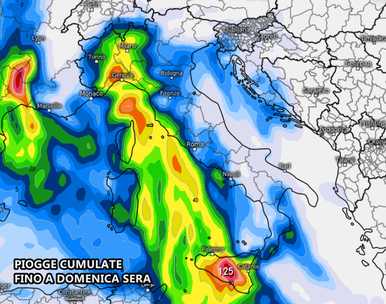 Il maltempo proseguirà anche nel fine settimana, con fenomeni più intensi sulle regioni tirreniche, sul Nord-Ovest e sulle isole maggiori. In particolare, in Sicilia, si prevedono accumuli pluviometrici significativi, con valori che potrebbero superare i 100-120 mm, specialmente a ridosso dei monti. Le regioni adriatiche, invece, saranno più asciutte, con molte nubi, qualche schiarita, ma poche piogge.