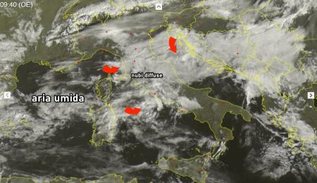 L’alta pressione sta vivendo una fase leggermente meno pimpante grazie all’intrusione di aria umida e instabile atlantica, come si evince anche dallo scatto satellitare. Tante nubi stanno invadendo la nostra penisola, in particolare al centro e al nord, ma le piogge sono quasi del tutto inesistenti considerando che ci troviamo pur sempre in un contesto anticiclonico.Qualche pioviggine potrebbe manifestarsi in giornata su Abruzzo e Molise, ma parliamo davvero di fenomeni di piccolissima entità. Cieli nuvolosi sul resto del centro e del lato tirrenico, ma senza fenomeni. Al nord le nubi su molte zone resisteranno fino a domenica mattina, dopodiché si diraderanno sotto i colpi del foehn.
