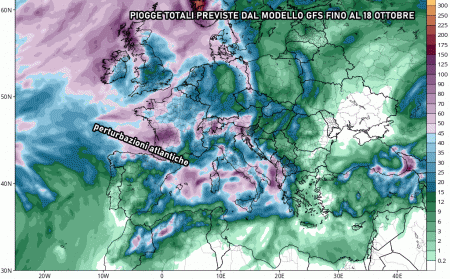 Questo peggioramento di metà ottobre è condiviso da entrambi i principali modelli matematici. Sia GFS che ECMWF propendono per un intenso peggioramento soprattutto al nord e sul lato tirrenico. Eloquenti le precipitazioni totali previste dal modello GFS fino al 18 ottobre: