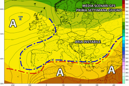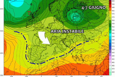 Subito dopo questa breve dase stabile ecco che l’anticiclone rischia di farsi nuovamente da parte. Le correnti più fresche alle alte quote potrebbero riprendere possesso del Mediterraneo, alimentando occasioni instabili a più riprese tra 4 e 7 Giugno. Non si prevedono, al momento, perturbazioni organizzate bensì tante note instabili sparse soprattutto tra le ore pomeridiane e serali.