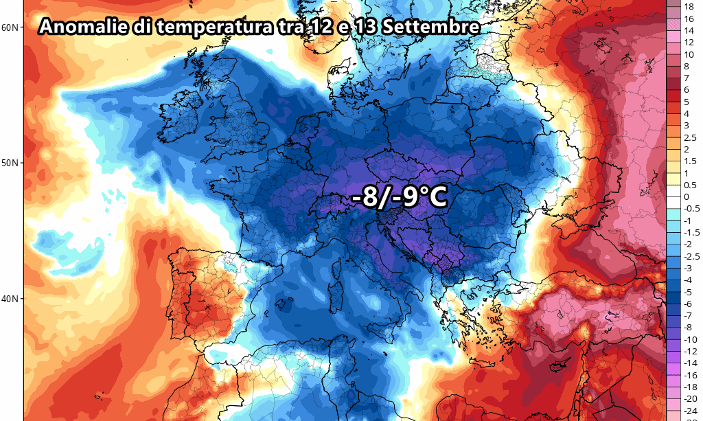 Eloquenti le anomalie previste tra 12 e 13 settembre dal modello americano GFS. Su gran parte dell’Europa centrale si prevedono fino a 8 o 9°C al di sotto delle medie del periodo, con l’Italia al centro di questa improvvisa fiondata fresca che a tutti gli effetti spazzerebbe via l’Estate dal Mediterraneo.