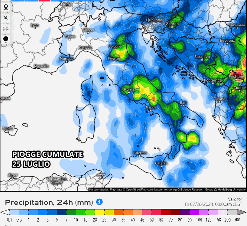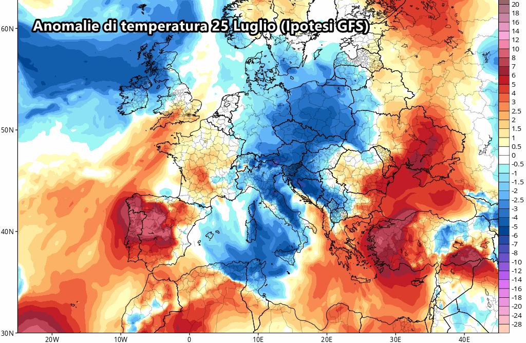 Le previsioni riguardanti le anomalie mostrano l’efficacia di questa massa d’aria proveniente da nord-est: tra 24 e 25 Luglio la colonnina di mercurio potrebbe scivolare addirittura sotto le medie del periodo, una vera notizia dopo oltre due settimane di temperature fortemente sopra la media.