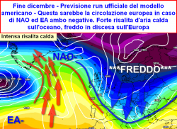 -con l’espansione di una attiva onda di calore dal medio Atlantico verso le latitudini polari e subpolari, l’aria fredda sarebbe obbligata ad avere un percorso molto più meridionale, gettandosi verso l’Europa centrale ed il bacino del Mediterraneo, avviando un sensibile abbassamento della temperatura su vaste aree del continente. Questo pattern è rappresentato dalla combinazione East Atlantic Oscillation e North Atlantic Oscillation entrambe in segno negativo. (EA-/NAO-)