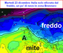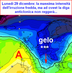 proverebbe almeno sino al primo gennaio a sfondare anche sull’Italia, con nevicate soprattutto sui versanti centro-orientali delle Alpi entro lunedì 29, per alcuni km anche oltre lo spartiacque alpino e poi ad imbiancare l’Appennino centro-meridionale a quote basse, abbassando ovunque le temperature.