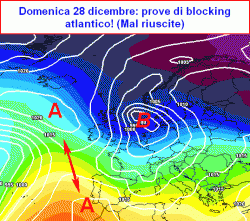 Già dal 26 dicembre ecco tornare la pioggia al nord e sulla Toscana con neve in montagna oltre i 1200m, ma la cosa importante succede subito dopo, domenica 28, quando una colata di aria artica intercetta un vortice depressionario in arrivo da ovest e regala una fase invernale al centro Europa con l’anticiclone delle Azzorre che tenta di collegarsi ad una cellula anticiclonica in pieno Atlantico (in parte di natura termica).
