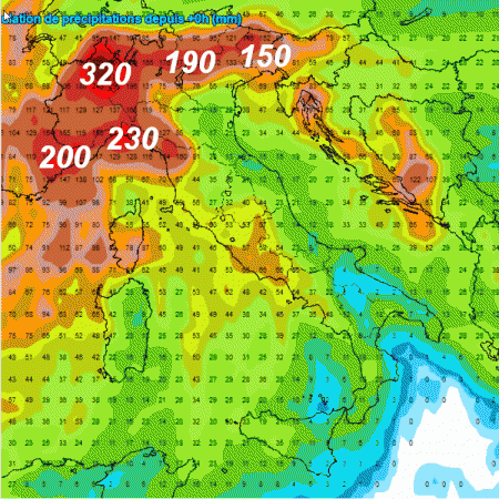 Si tratta di accumuli pluviometrici pesanti per alcune zone del nord. In particolare, il modello segnala 320mm tra la bassa Val d’Aosta e l’alto Piemonte; 230mm sulla Liguria, 200mm sulle Alpi Marittime, 190mm sulle prealpi lombardo-venete e 150mm sul Friuli. Anche il versante tirrenico, la Sardegna e l’ovest della Sicilia verranno interessate da accumuli piovosi "interessanti" fino a 60-70mm nel Lazio.