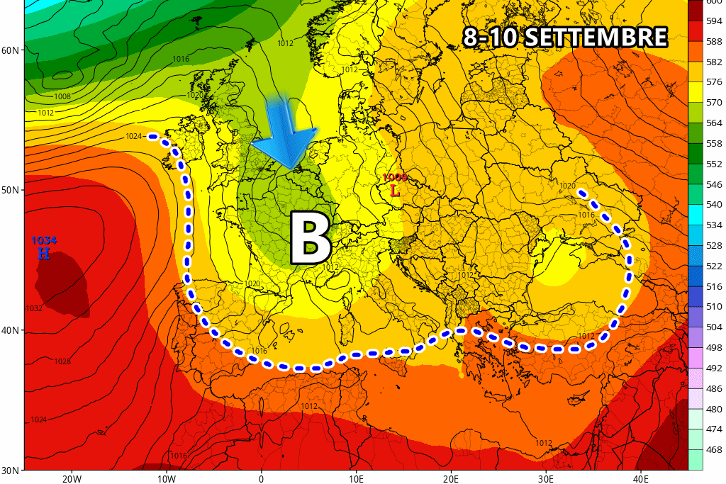 Analizzando la simulazione modellistica pomeridiana del modello GFS, possiamo notare il presunto avvicinamento di una vasta saccatura colma di aria fresca nordatlantica verso l’Europa centrale e infine sul Mediterraneo. Il suo approdo in Italia potrebbe concretizzarsi attorno all’8 settembre e, proprio da questa data in poi, potremmo registrare la fine pressoché definitiva del gran caldo subtropicale.