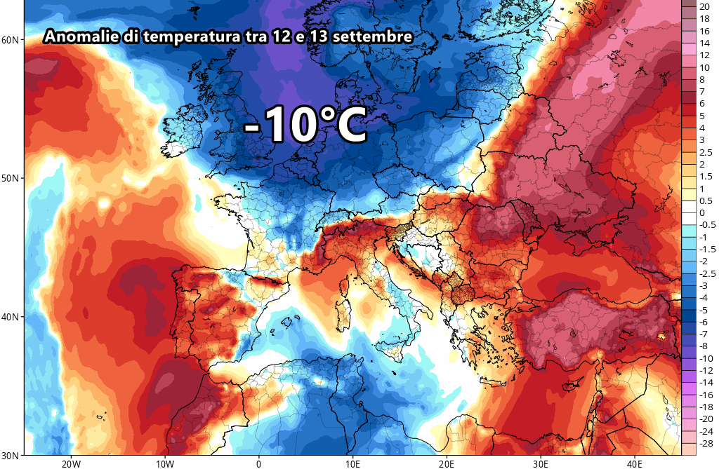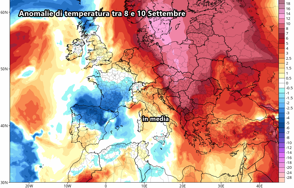 Dal punto di vista termico, le previsioni delle anomalie ci mostrano una netta spallata alla colonnina di mercurio già tra l’8 e il 10 settembre, tanto che su gran parte d’Italia potremmo quantomeno rientrare in quelle che sarebbero le tipiche medie del periodo.