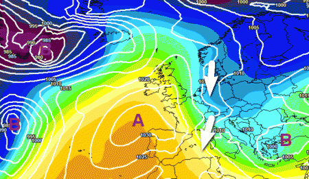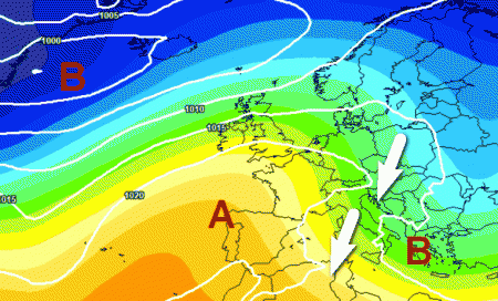 Ecco le correnti fredde sull’Italia in risposta alla rimonta dell’alta pressione sull’Europa occidentale. Gli effetti saranno presenti soprattutto sui settori orientali e al meridione in fatto di freddo, vento e neve a quote da valutare, anche se il calo termico sarà esteso a tutta l’Italia.