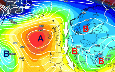 Notate l’alta pressione molto forte posizionata in Atlantico. Sul suo bordo orientale scenderanno correnti fredde di matrice artica con condizioni di instabilità fredda sull’Italia, soprattutto sui settori orientali, ma non solo…