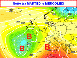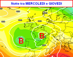 Nel prossimi giorni l’alta pressione tenderà a cedere, dapprima lentamente, poi in modo abbastanza brusco. Ciò consentirà lo spostamento della depressione iberica verso levante con conseguente peggioramento del tempo ad iniziare dai settori occidentali della Penisola (prima mappa).