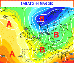 Sabato 14 maggio (terza cartina), la depressione responsabile del maltempo italico tenderà a spostarsi sull’Europa orientale, ma il tempo in Italia non migliorerà subito.