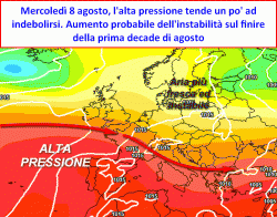 Sul finire della prima decade di agosto il modello europeo identifica un graduale indebolimento dell’anticiclone sul Mediterraneo, accompagnato da condizioni atmosferiche più instabili ed una probabilità maggiore di temporali (da confermare).