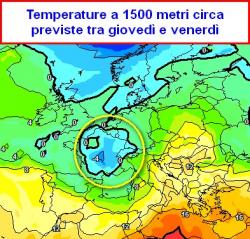 In prossimità dell’Esagono Francese si prevedono temperature a 1500 metri di quota (circa) fino a -4°, a cui potrebbero corrispondere temperature al suolo di poco superiori allo zero.
