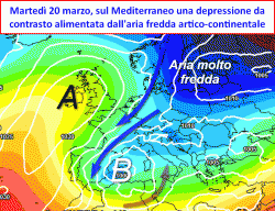 La circolazione atmosferica relativa a questo mese di marzo, raggiungerá nei prossimi giorni l’apice assoluto di complessità: sullo scacchiere barico del nostro continente vi saranno diversi protagonisti in gioco, ciascuno dei quali con precise caratteristiche profondamente diverse tra loro. Nell’immediato futuro, senza dubbio l’elemento che più di altri attira la nostra attenzione, è il vistoso anticiclone collocato in posizione fortemente anomala sui settori settentrionali europei (Penisola Scandinava), laddove sono previsti valori particolarmente intensi di freddo. Suddetto anticiclone rappresenterà infine l’elemento trainante che consentirà la discesa dell’aria artico continentale verso la Mitteleurope, attesa proprio nel weekend ormai imminente.