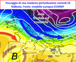In un contesto "quasi" primaverile, una modesta perturbazione attraverserà l'Italia tra venerdì 24 e sabato 25. In seguito nuovamente il rinforzo di una figura anticiclonica sul Mediterraneo.
