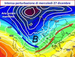 Superata l’enfasi dell’anticiclone natalizio, a partire dal giorno di S.Stefano un’importante figura di bassa pressione tornerà a monopolizzare il tempo sul bacino centrale del Mediterraneo, laddove ci aspettiamo il passaggio di una intensa perturbazione a cavallo tra mercoledì 27 e giovedì 28 dicembre. La nuova perturbazione sarebbe seguita da un quantitativo abbastanza corposo d’aria fredda di origine polare-marittima e con essa una riduzione delle temperature che potrebbe riportare i fiocchi di neve sino a quote molto basse soprattutto sull’angolo nord-ovest. Sarebbe inoltre una ghiotta occasione di pioggia per le zone pianeggianti e per le regioni del versante tirrenico.
