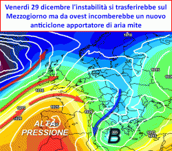 Venerdì 29 dicembre il modello europeo mette inoltre in evidenza il passaggio di un secondo, rapido corpo nuvoloso ancora con instabilità prevista sui versanti tirrenici,