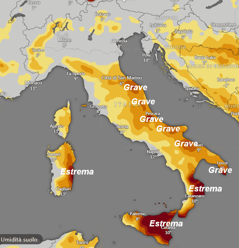 Le situazioni più critiche, con un grado di siccità estrema, le ritroviamo sull’est della Sardegna, quasi tutta la Sicilia e la Calabria Ionica. Queste sono le regioni più a rischio per la prossima stagione estiva.