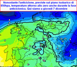 Nell’ambito della Pianura Padana, come anticipato, vi sarà un periodo di relativa stabilità imposta dall’espansione di una figura anticiclonica sull’Europa centrale. La parte più calda di questo anticiclone resterà però confinata all’oceano Atlantico, senza raggiungere il nostro continente. Le temperature sul nostro Paese saranno soggette ad una modesta risalita; sul piano isobarico di 850hpa (circa 1500 metri) riusciranno a mantenersi sul filo degli 0°C. Su questo ambiente predisponente troveranno dimora nebbie anche tenaci che popoleranno la Valpadana tra la sera di lunedì 4 dicembre sino a giovedì 7. Le temperature all’interno della coltre nebbiosa saranno probabilmente negative e questo favorirà la condensazione della nebbia in minuscoli cristalli di ghiaccio sugli oggetti sopraelevati dal terreno.