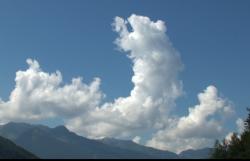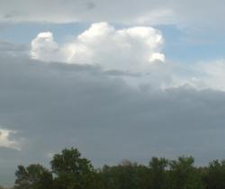 Un ultimo caso vede invece una situazione potenzialmente pericolosa. In mezzo agli strati infatti spicca un cumulo già sviluppato nella fase calvus, che segnala aria molto instabile e foriera di rovesci a sfondo temporalesco, localmente anche forti. Nonostante il cielo non risulti particolarmente minaccioso, a causa dell’umidità che limita i contrasti e nasconde la base del cumulo, il temporale potrà insomma rivelarsi presto con tutto il suo "nero". In queste situazioni in montagna è sempre bene affrettarsi a cercare un riparo in baite o rifugi.