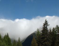 Un altro caso vede della nuvolosità appoggiata alla cresta principale delle Alpi. Si tratta di stau che trabocca leggermente sui versanti meridionali. Se prevedete una traversata oltralpe attraverso sentieri di montagna mettete in conto di finire rapidamente in mezzo alla nebbia e poi di sperimentare anche delle precipitazioni, una volta superato lo spartiacque. Se la corrente presente sulle Alpi è forte lo stau potrà valicare per alcuni km la cresta alpina, ma se, come in questo caso, risulta debole, se rimarrete sui versanti meridionali, cioè sottovento, non correrete alcun pericolo che il tempo si guasti. Anzi, vista la giornata estiva, potrete contare sul fatto che la colonna d’aria andrà seccandosi nelle ore successive e il panorama apparirà più netto anche sulle creste confinali.