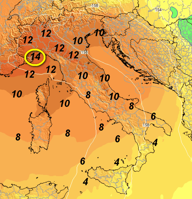 Sul nord-ovest si prevedono isoterme alla medesima quota comprese tra 12 e 14°, in pratica una decina di gradi superiori alla media. In quota sarà primavera inoltrata, mentre le sottostanti pianure saranno quasi interamente avvolte da fitte nebbie, freddo ed inquinamento alle stelle. Una bruttissima situazione che potrebbe dare il colpo di grazia alla coltre nevosa sopravvissuta alle recenti scaldate in montagna. Le temperature tenderanno a decrescere da nord a sud fino ad un minimo di 3-4° a 1500 metri ubicato sulle estreme regioni meridionali.